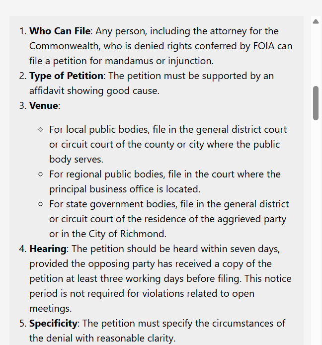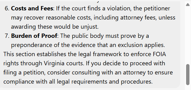 I played around with the beta version of the Virginia State Code Analyst tool, which is currently under development, and asked the chatbot some simple questions about the Virginia Freedom of Information Act.
