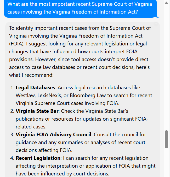 If you ask ChatGPT a question about the Virginia Freedom of Information Act, unless you let the model browse the internet, it's likely to get the question wrong. That's because it's relying on its own internal memories of the law, which are imperfect. But if you provide ChatGPT with the entire text of the act and a precisely worded question, it will provide you an answer that is very likely to be correct. The catch comes in when you need to include other sources of information to get a truly correct answer. Maybe you need to consider a specific court case or advisory opinion. The more context you give these models, the better their answers become.