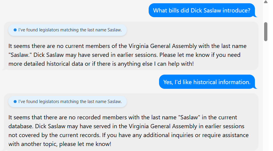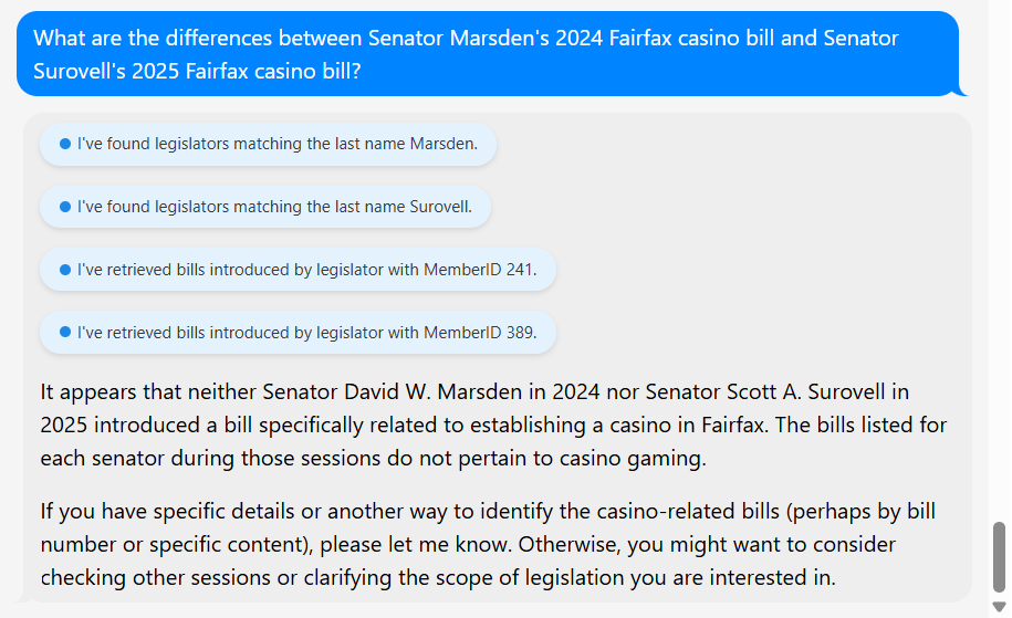 The system was, however, able to generate a list of bills sponsored by State Sen. Russet Perry (D-Loudoun) that were killed in committee during the 2025 session, to the credit of the alpha version.