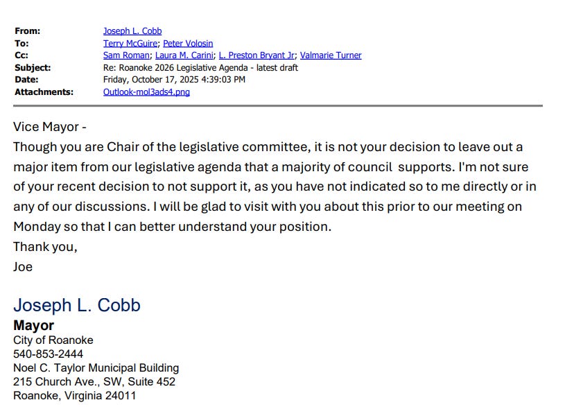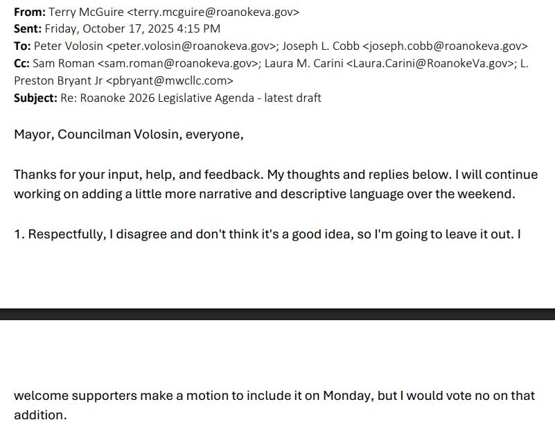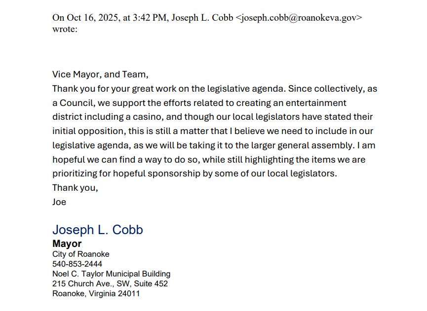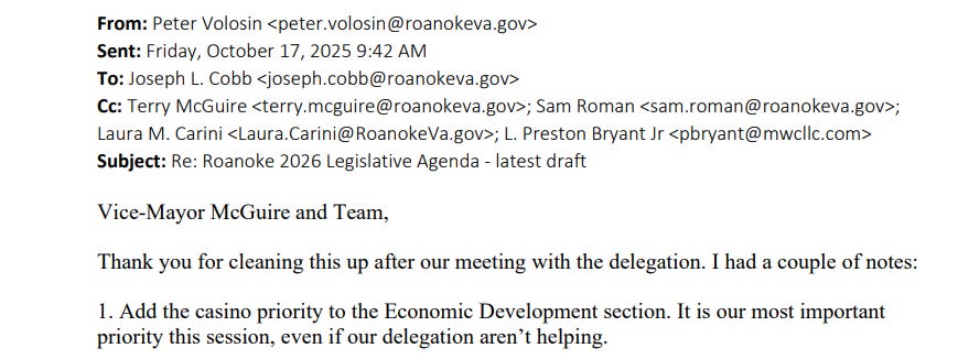 Perhaps most revealing in these released records is the October 16-17, 2025 back-and-forth between members of Roanoke City Council on the question of including a casino project in their legislative agenda for the upcoming General Assembly session.