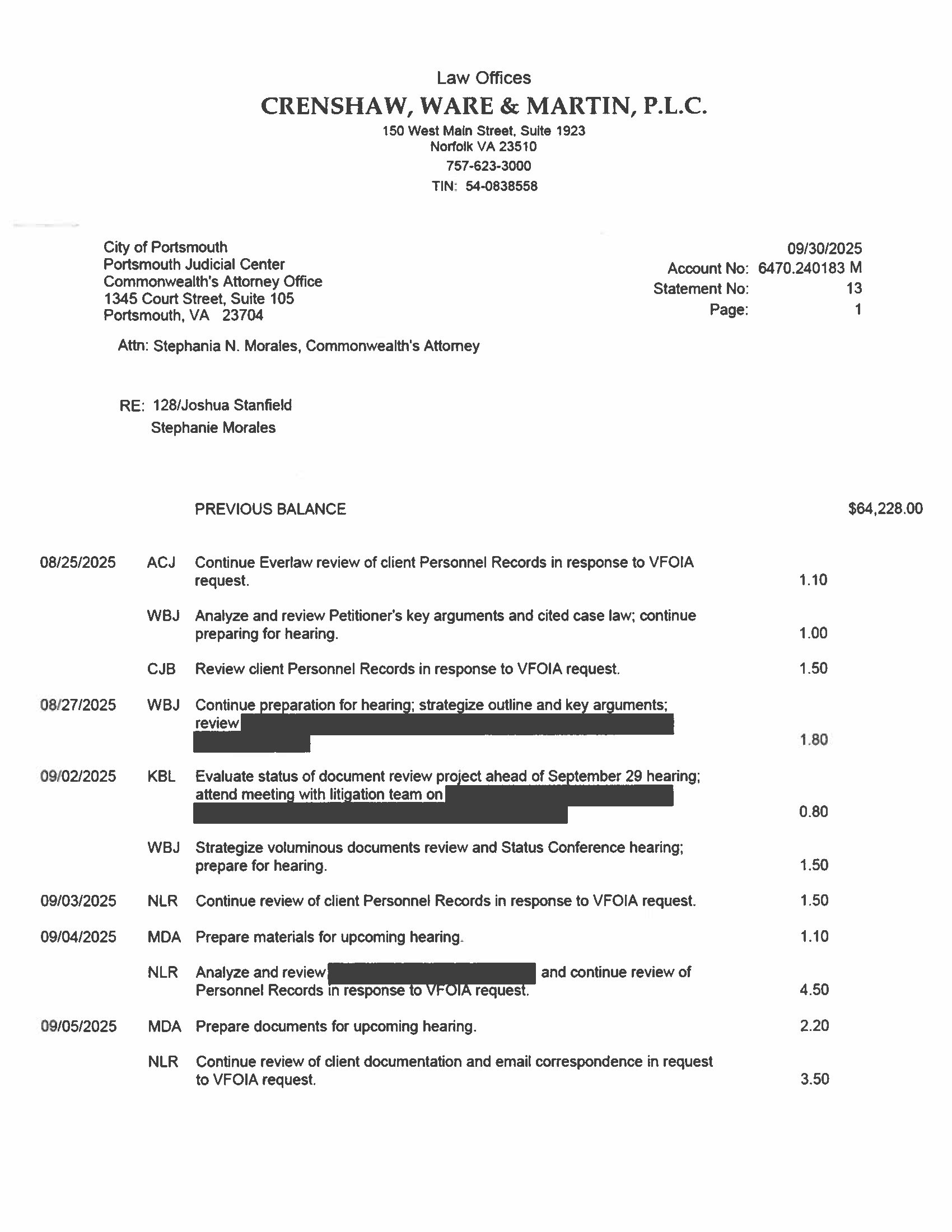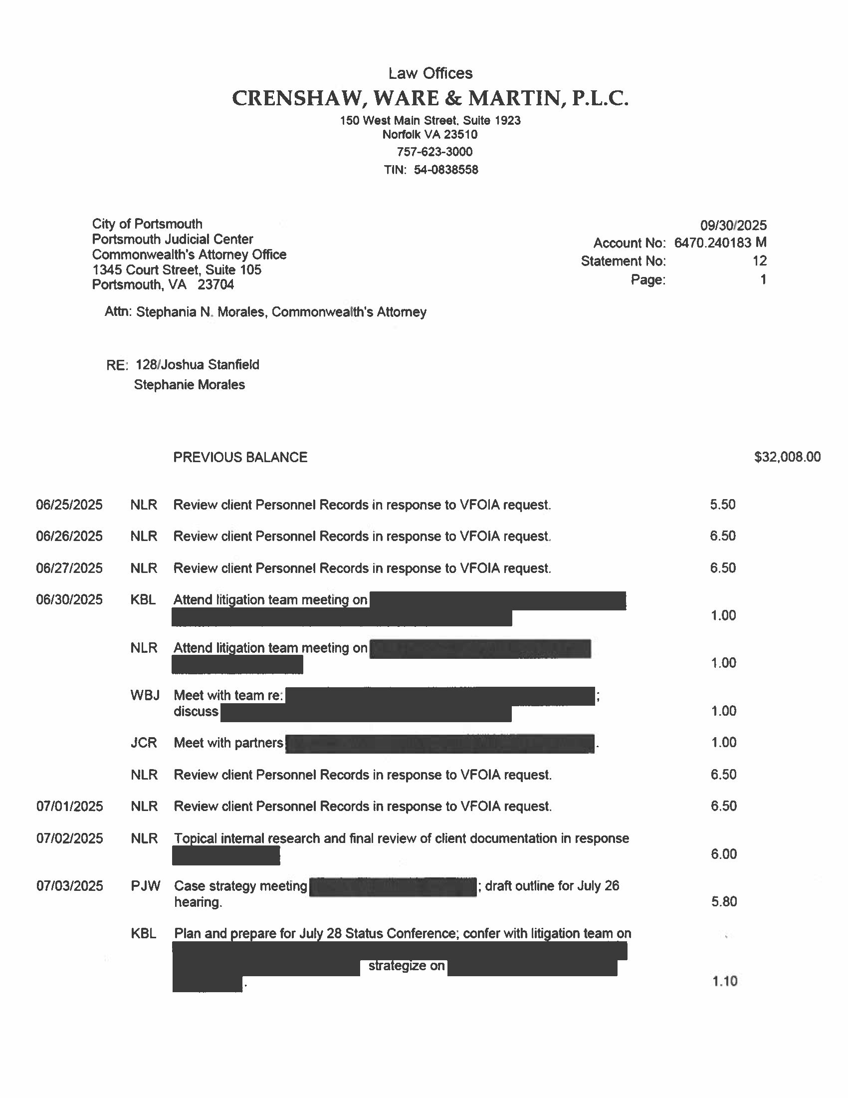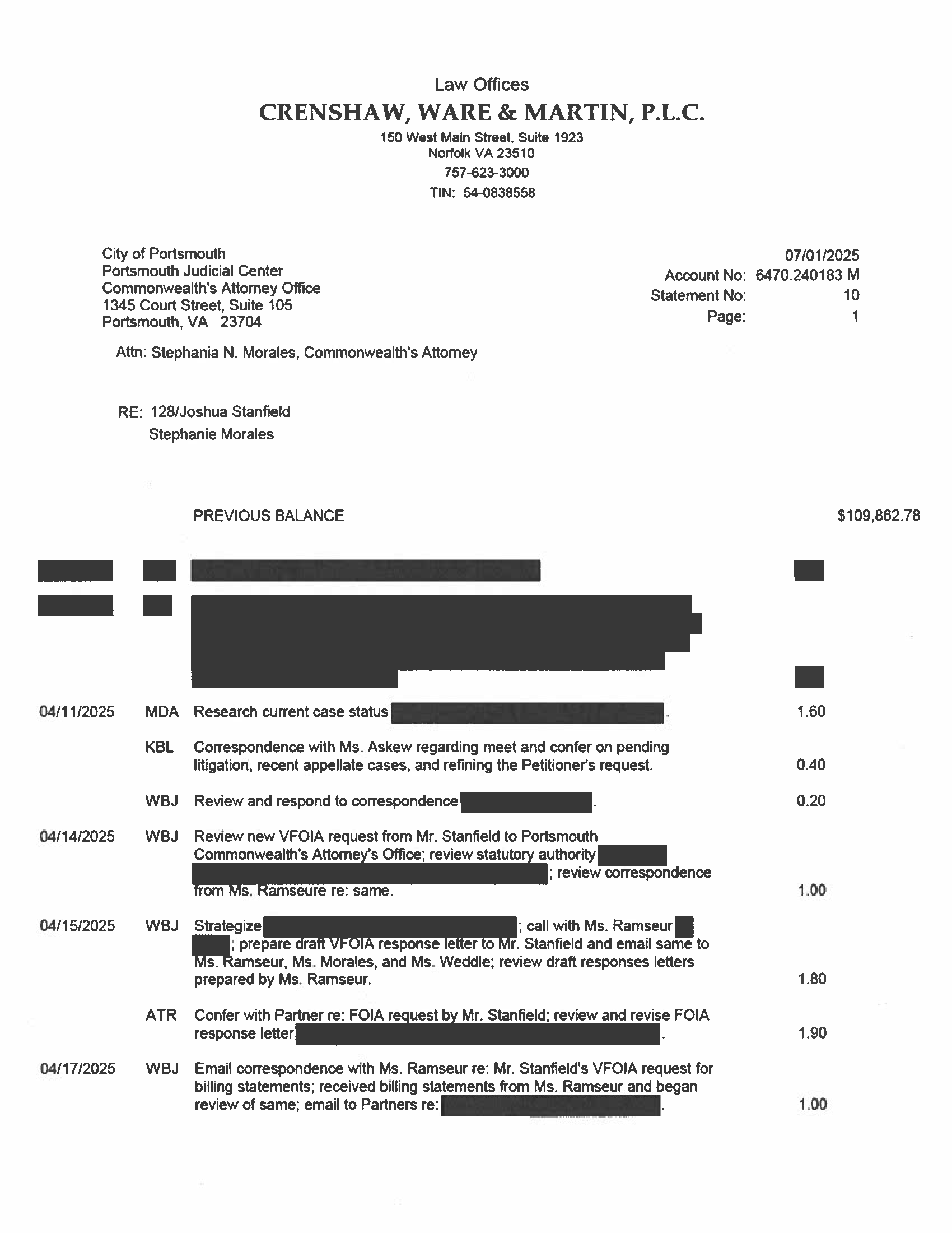On September 14, 2025, I submitted a FOIA request to Morales’ office seeking “any bills/invoices sent to the Commonwealth’s Attorney’s office concerning my FOIA case in Portsmouth Circuit Court, Stanfield v. Morales (CL24-1176), including any bills/invoices from Crenshaw, Ware & Martin, from April 11, 2025 until today.”