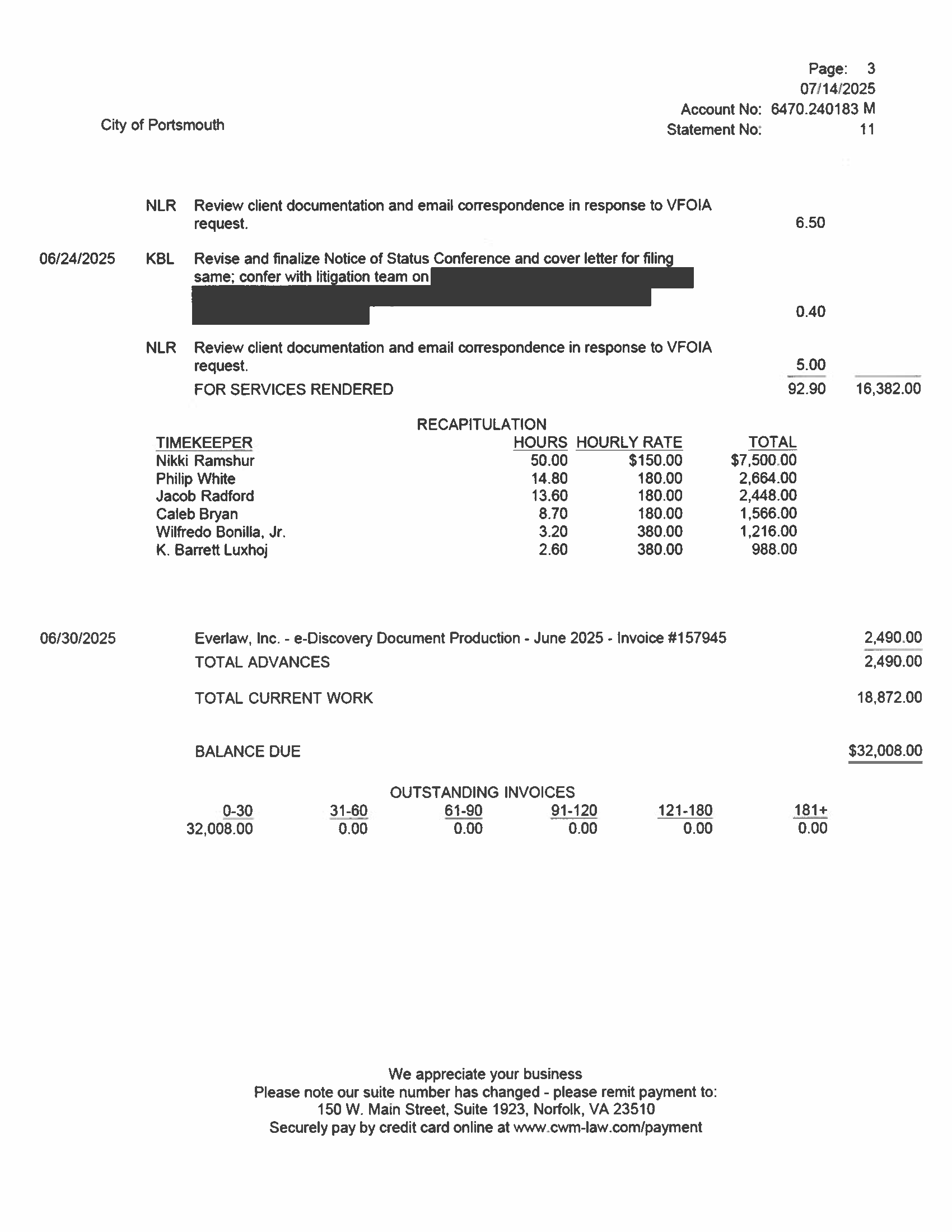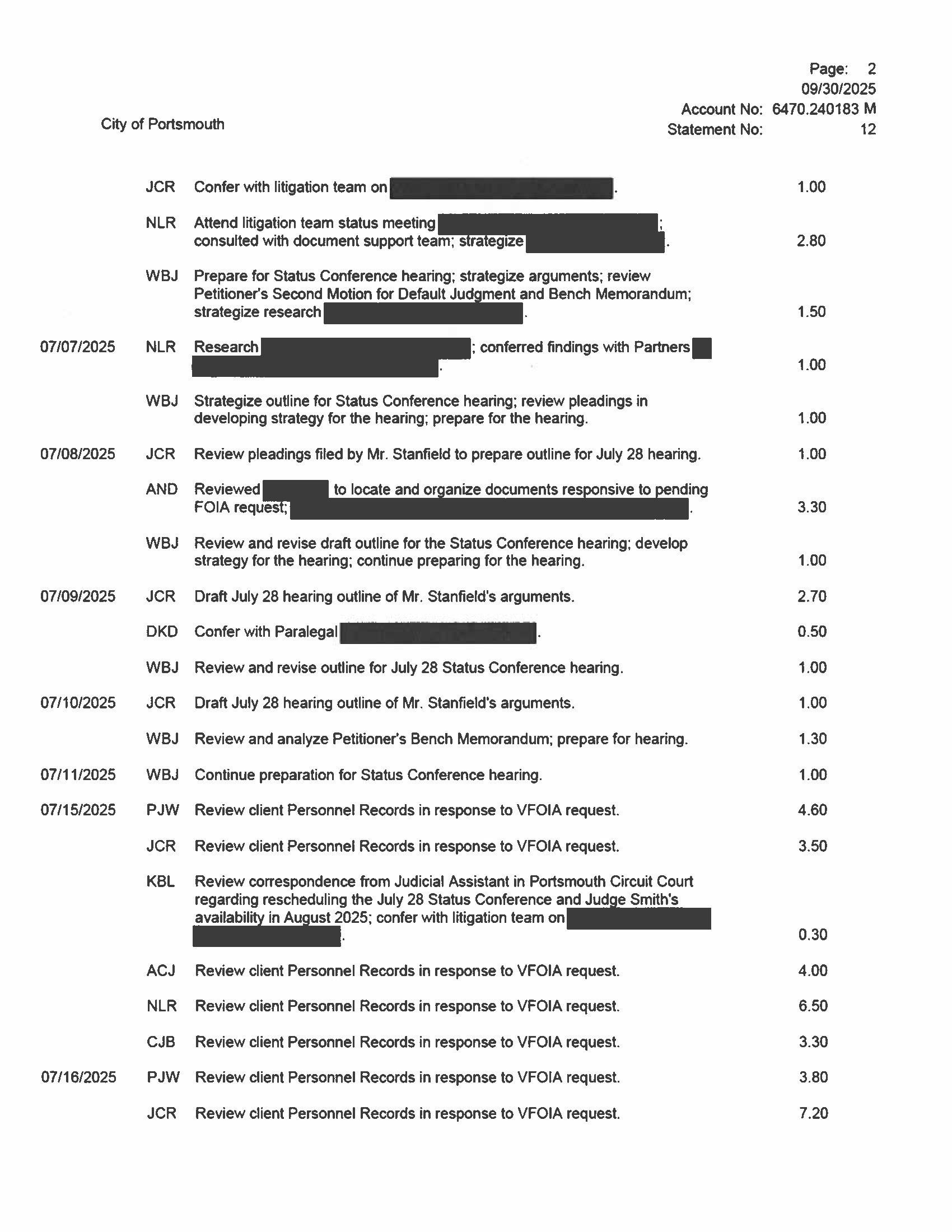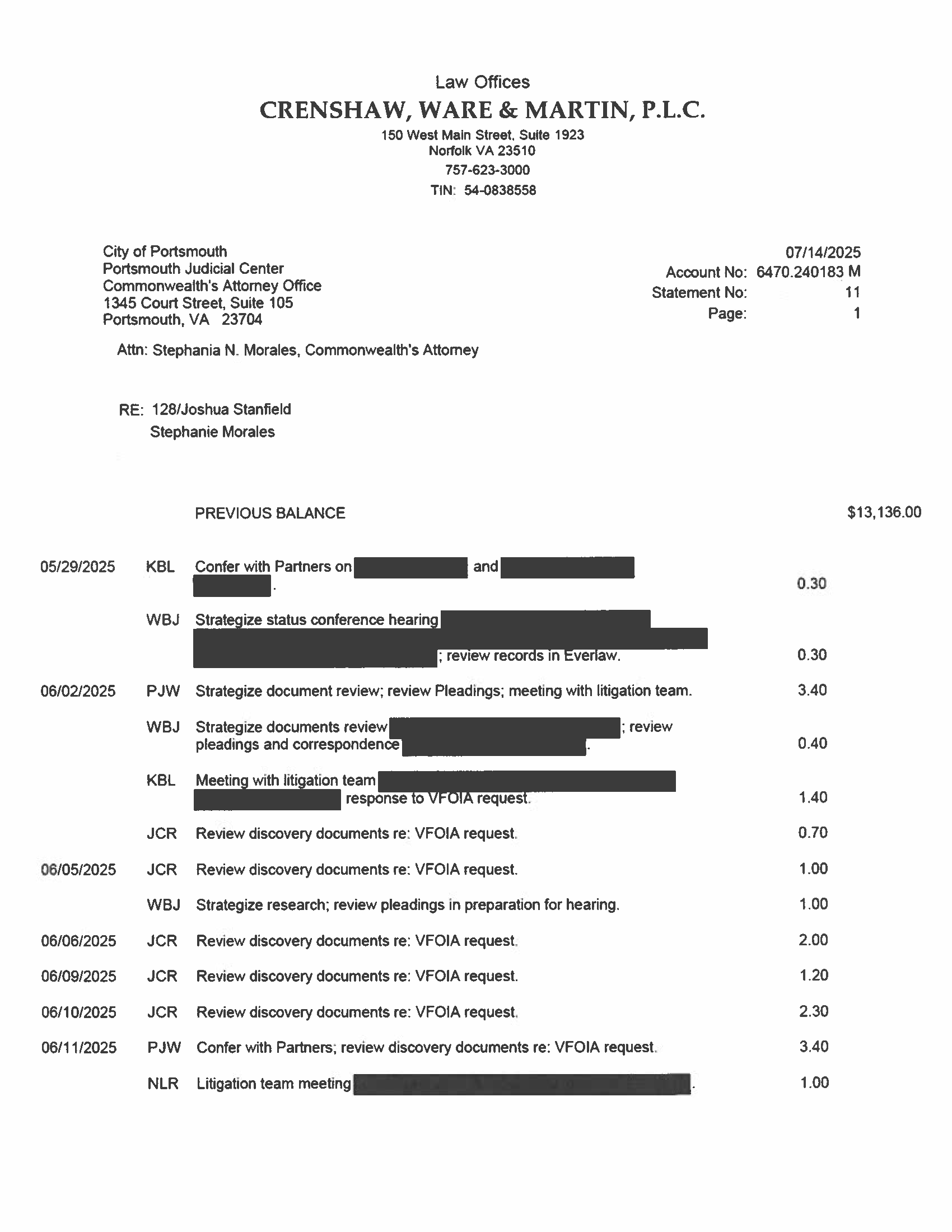 On September 14, 2025, I submitted a FOIA request to Morales’ office seeking “any bills/invoices sent to the Commonwealth’s Attorney’s office concerning my FOIA case in Portsmouth Circuit Court, Stanfield v. Morales (CL24-1176), including any bills/invoices from Crenshaw, Ware & Martin, from April 11, 2025 until today.”