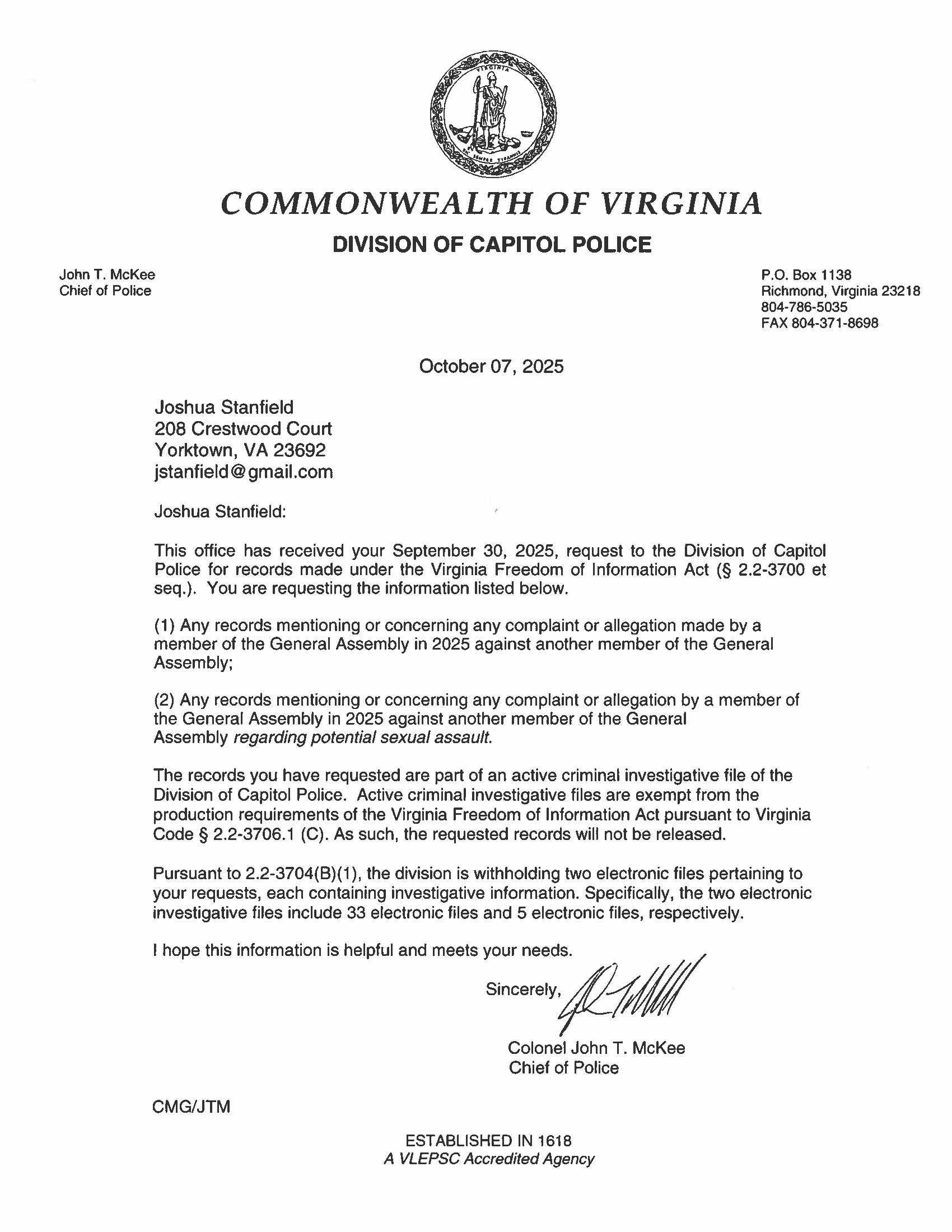 The Virginia Capitol Police elaborated on active criminal investigation(s) in the General Assembly while new invoices were produced in the Portsmouth Commonwealth's Attorney's FOIA case.