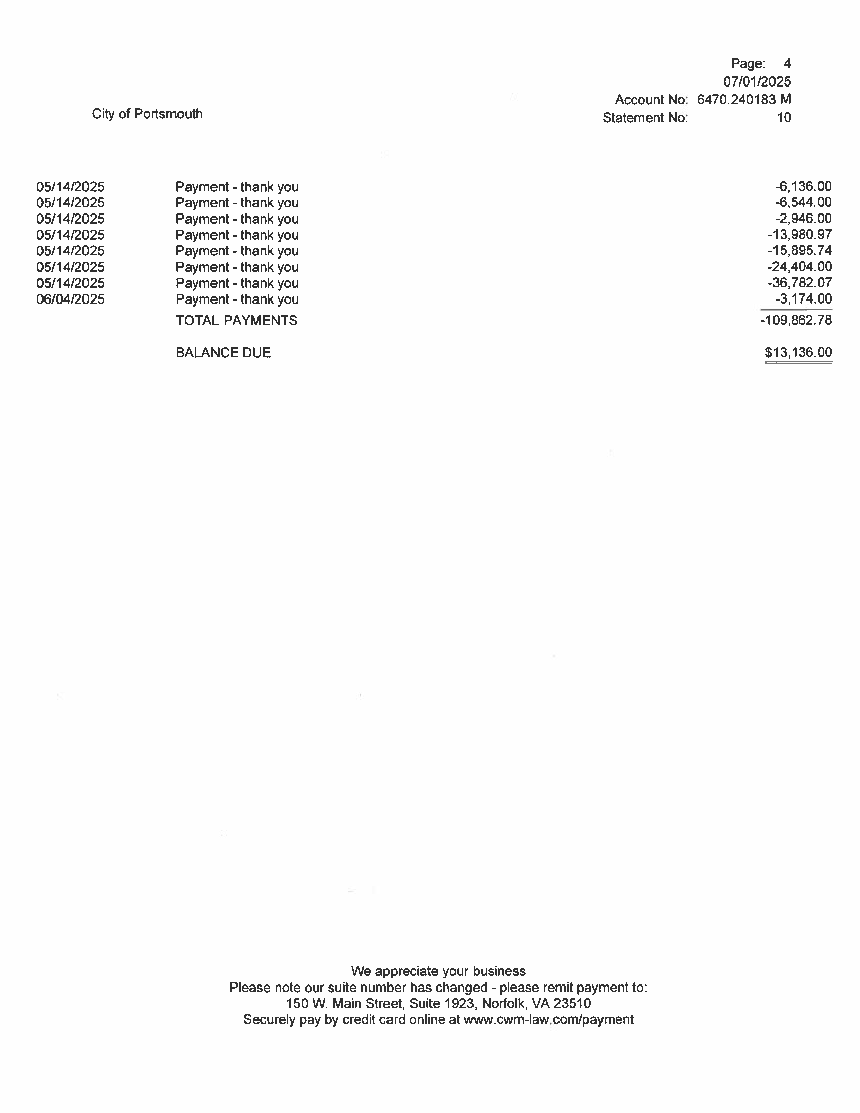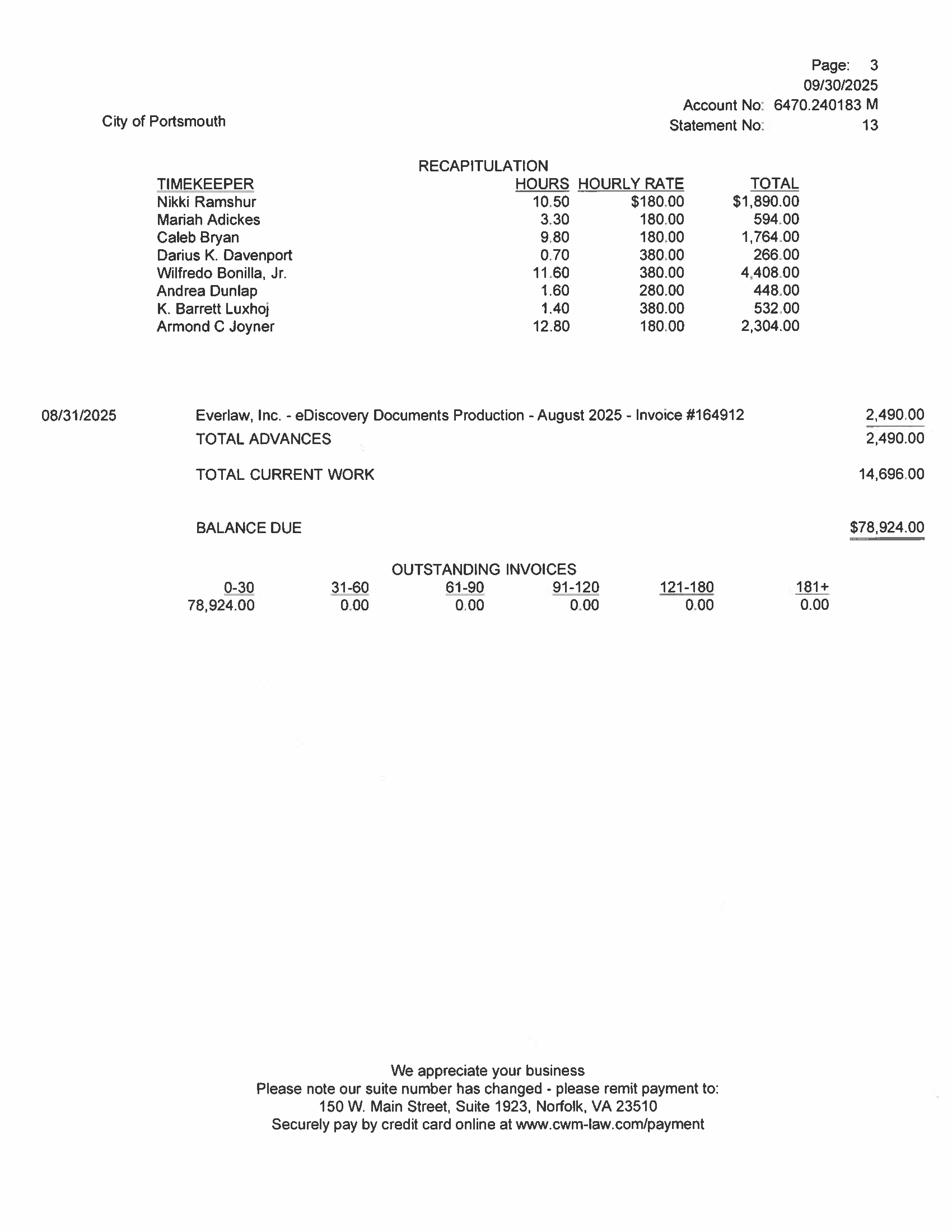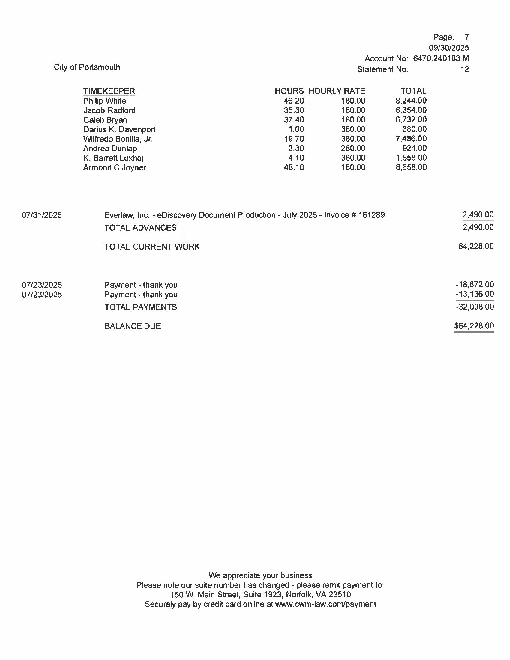 These records show that private law firm Crenshaw, Ware & Martin has billed the Portsmouth Commonwealth’s Attorney’s office $110,932 in total for services rendered from April through August of this year in this case. Add that to the $140,612.78 billed for services rendered prior to April, and the sum just barely exceeds a quarter million dollars.