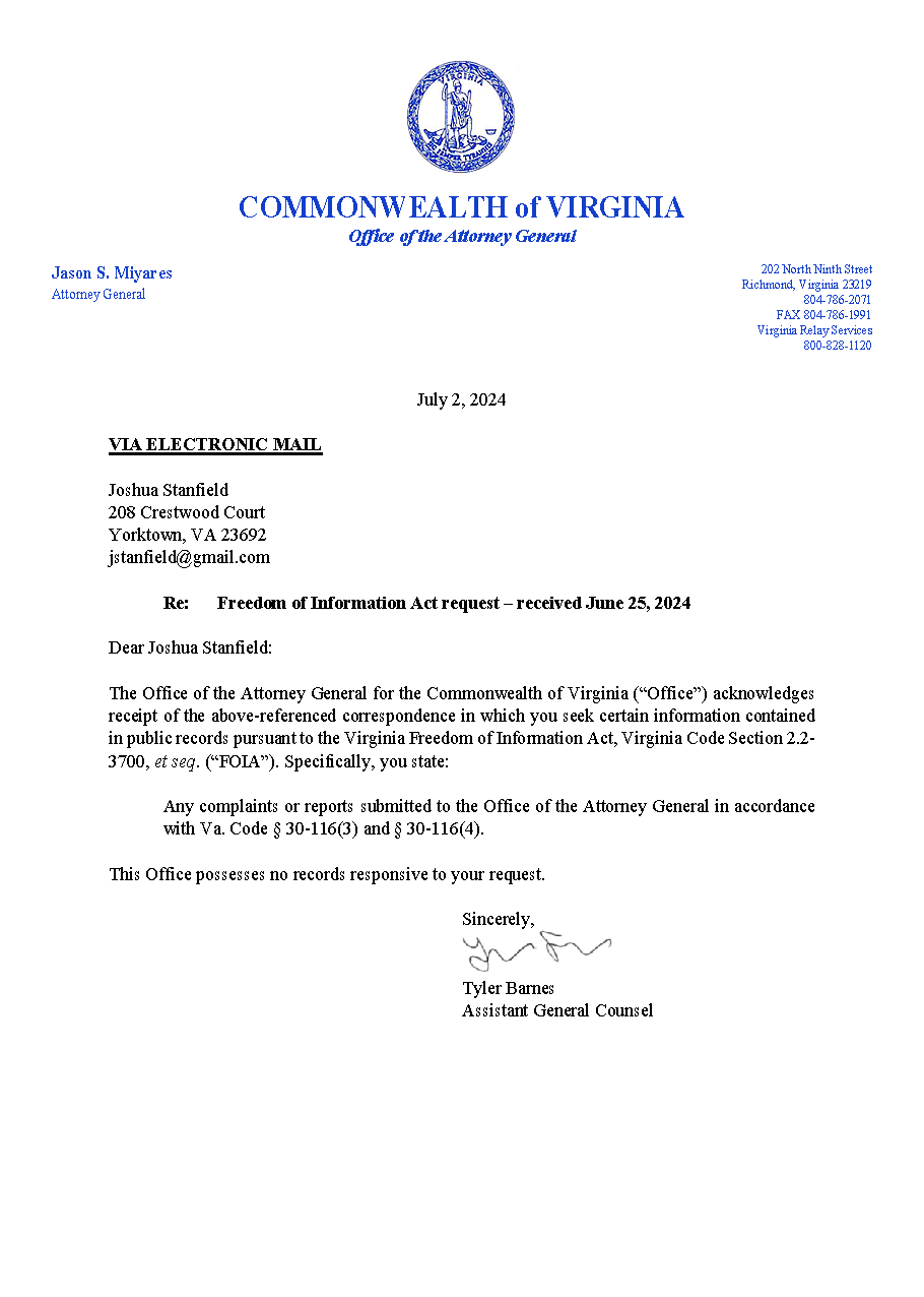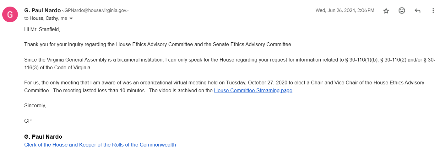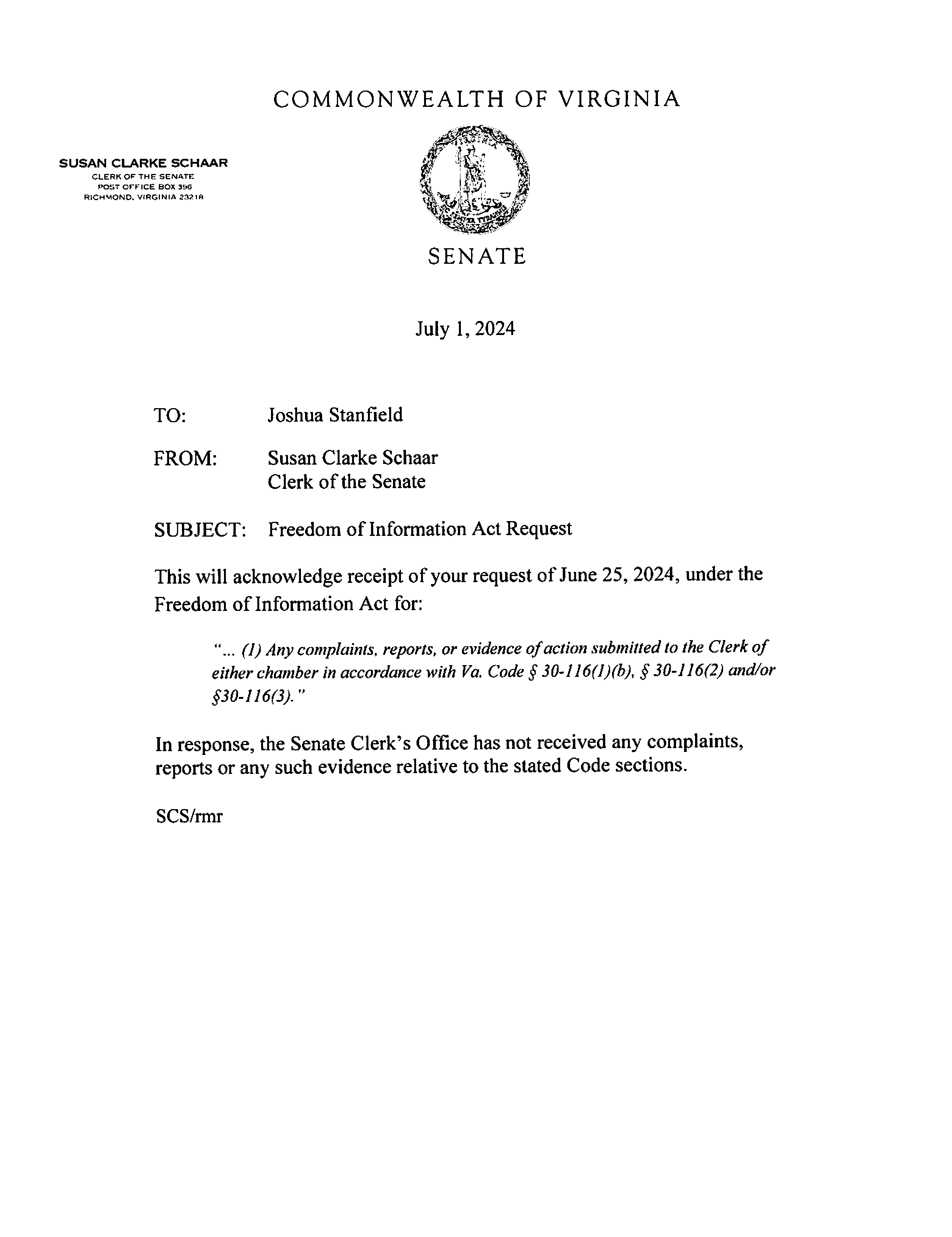 On June 25, 2024, I sent a FOIA request to both Senate Clerk Susan Schaar and House Clerk G. Paul Nardo seeking “[a]ny complaints, reports, or evidence of action submitted to the Clerk of either chamber in accordance with Va. Code § 30-116(1)(b), § 30-116(2) and/or § 30-116(3).”