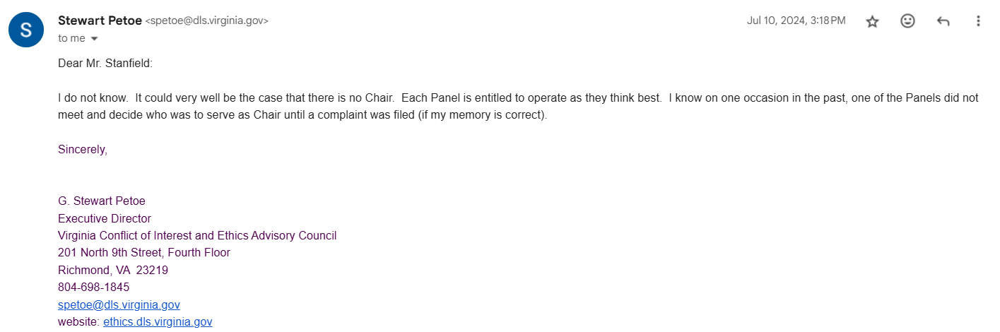 On May 12, 2024, I sent a FOIA request to Stewart Petoe, Executive Director of the Virginia Conflict of Interest and Ethics Advisory Council, seeking: